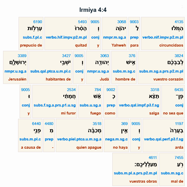 La Biblia interlineal muestra el texto en hebreo (en negro) y traducción palabra por palabra al español (en rojo) de Jeremías 4:4. Recuerden que el hebreo se lee de derecha a izquierda.