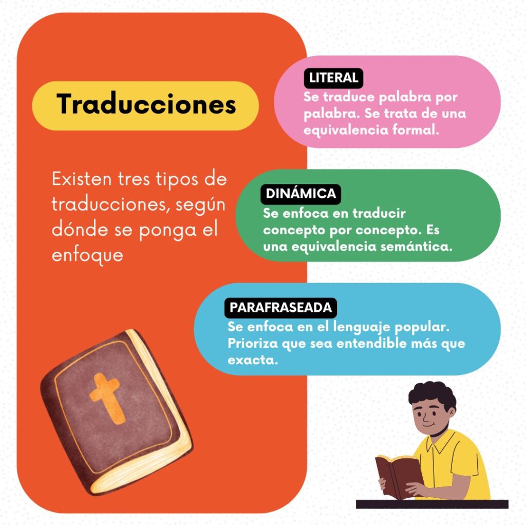 Cada traducción tiene su propia historia, metodología y propósito específico. Unas se ciñen a los originales hebreo y griego (literales); otras adaptan el texto para ser más legibles para la gente de hoy (dinámicas) y las parafraseadas vuelven a contar el mensaje de las Escrituras en un estilo más informal, más narrativo. Algunos autores incluyen las versiones parafraseadas dentro de las dinámicas.